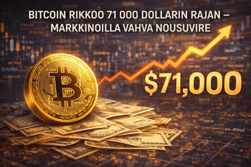 Bitcoinin hinta nousi voimakkaasti yli 71 000 dollarin, kun kryptomarkkinoille virtasi uutta pääomaa ja sijoittajien riskinottohalukkuus kasvoi selvästi. Nousu tapahtui nopeasti ja laajalla volyymilla, mikä viittaa vahvaan institutionaaliseen ja yksityissijoittajien kysyntään.